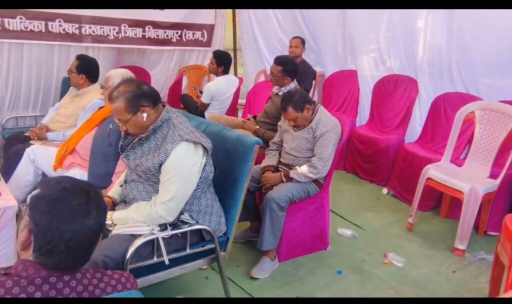 तखतपुर नगर में अटल बिहारी वाजपेई जयंती पर आयोजित सुशासन दिवस कार्यक्रम में जिस वक्त मुख्यमंत्री विष्णु देव साय का वर्चुअल में भाषण सन्देश चल रहा था.. उस दौरान प्रदीप कौशिक और जीवनलाल पांडेय के अतिरिक्त सिर्फ नगरपालिका के सीएमओ और कर्मचारी बैठे हैं… भाजपा का कोई भी जनप्रतिनिधि कोई भी मंडल का पदाधिकारी मौजूद नहीं था… खाली खाली कुर्सियों इस बात का सबूत है… जिसे समाचार के साथ वीडियो में भी स्पष्ट रूप से देखा सुना जा सकता है…